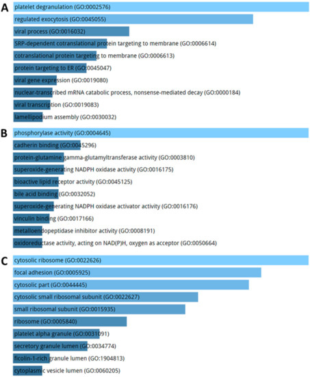 KEGG pathways enriched by DE genes highlighted terms related to ribosome, focal adhesion, and atherosclerosis (Figure 7). The GO enriched terms for biological process are represented by exocytosis and protein targeting membrane (Figure 8A). GO molecular function analysis resulted in ribosome and focal adhesion (Figure 8B). With respect to cellular components, the most enriched GO concern phosphorylase and oxidase activity (Figure 8C).
