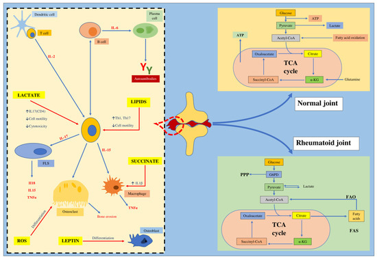 Treatment with anti-tumor necrosis factor-α (anti-TNF-α) agents and janus kinase (JAK) inhibitors, like tofacitinib, mitigate glycolysis in the synovium of RA patients [62]. Tocilizumab (anti-IL-6 blocker) curbs the oxidative stress (OS) conditions in leukocytes of RA patients [63]. Therefore, numerous drugs have been identified in RA treatment by affecting the metabolic signaling pathways to mitigate inflammatory responses in both in vitro and in vivo models of RA [42,53,64,65]. Similarly, evaluating the role of lipid metabolism in RA can prove to be effective for the development of suitable therapeutic possibilities and associate lipid metabolism abnormalities to RA [34]. Figure 1 depicts the inflammatory processes in synovial tissue of RA patients, along with multiple metabolic alterations.