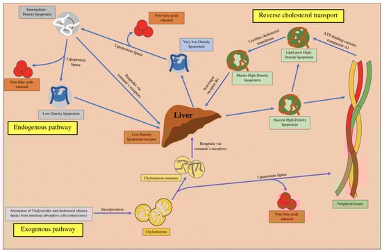 Two types of pathway, mainly the exogenous and endogenous pathway, act independently and promote the transportation of dietary lipids in the blood, promoting hepatic and peripheral movement of lipids from the small intestine (Figure 2).