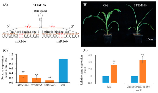 Increasing studies have demonstrated that STTM technology is an ideal approach for plant miRNA functional investigation [32,42]. A STTM resource of the model and crop plants was developed previously, in which maize pTF101.1-STTM166 vector was constructed [32]. The vector was designed as a 48 nt length spacer flanked by two uncleavable miR166 binding sites, which was driven by the 2 × 35S promoter (Figure 1A). Here, the pTF101.1-STTM166 vector was selected and transformed in maize inbred line C01 by Life Science and Technology Center, China Seed Group Co., Ltd. (Wuhan, China). The screened STTM166 plants exhibited classic severe leaf curling (Figure 1B). To further verify the transgenic plants, the expression levels of miR166 and its potential target genes were examined by qRT-PCR analysis (Figure 1C,D). In STTM166 plants, the expression levels of miR166 decreased significantly, only 9.7–33% comparing with the C01 plants. As expected, in the STTM166 plants, the potential miR166 target genes, Rld1 and Hox33, were up-regulated for 1.5 and 2.3 folds. These results indicated that the miR166 family was successfully silenced by STTM, and consequently released their target genes.