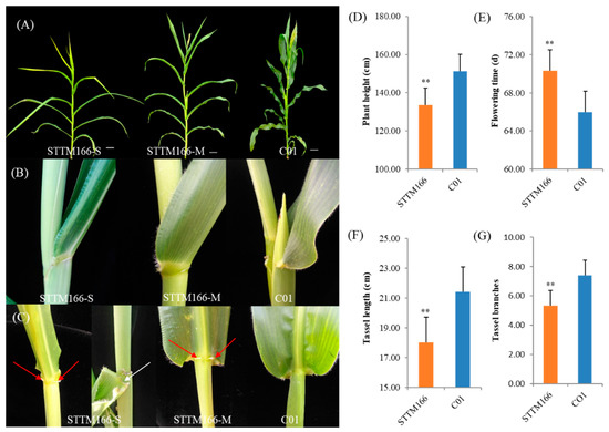 The phenotypic alterations of plant architecture, leaf shape, flowering and tassel branching mediated by miR166 inactivation. (A–C) The representative phenotypes of C01 and STTM166 of whole plants, leaf curling and leaf base. Bar represents 10 cm. STTM166-S, STTM166 plants with strong phenotypic alterations; STTM166-M, STTM166 plants with moderate phenotypic alterations. The leaf of STTM166 plants has an abaxial ligule (Red arrowhead); The STTM166-S plant developed a brittle leaf blade base and may resulted in abnormal leaf abscission (White arrowhead). (D–G) Comparisons of plant height, flowering time, tassel length and branches between C01 and STTM166 plants. In all case, ** represents that the corresponding phenotypic values of STTM166 plants are very significantly different from the wild type p < 0.01. Bars show standard error of phenotypic values.