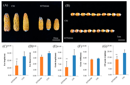 Among the screened STTM166 plants, phenotypes of leaf curling and developmental phase change exhibited significant variance (Figure 2A–C). These STTM166 plants with strong leaf curling (STTM166-S) always display severe developmental phase transition delaying. Those STTM166 plants with moderate leaf curling (STTM166-M) exhibited weak alteration in developmental phase transition. It is implied that these two developmental processes are likely controlled by the same genetic pathway. Similar to the Rld1 plants, the moderate and strong phenotypic STTM166 plants grew an abaxial ligule [35]. Strikingly, the STTM166-S plants developed a brittle leaf blade base, which may result in abnormal leaf abscission (Figure 2C). Moreover, STTM166 plants showed shorter plant height, later flowering time, and smaller tassel size in comparison with the C01 plants (Figure 2D–G). The reduced plant height and postponed flowering time are probably coincident with developmental transition delaying. The small tassel size of STTM166 plants hinted that miR166 is possibly involved in tassel development. Upon the yield-related traits, STTM166 plants showed small ears and grains (Figure 3). Compared with C01, the ears and grains of STTM166 were relatively shorter, and the 100-grain weight was relatively lighter. Furthermore, the ears of STTM166 plants displayed ambiguous ear rows. However, there were no significant differences in the ear diameter and grain width between STTM166 and C01. These results revealed that miR166 confers maize ear and grain development in a novel manner.