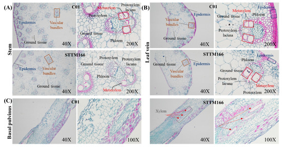Cross sections of stem, leaf vein and basal pulvinus of C01 and STTM166 plants. (A) Cross sections of plant stem of C01 and STTM166 (40× and 200×). Vascular bundles are marked in orange frame and font; Epidermis is marked in dark-bule font; Metaxylem vessels are marked in red frame and font. (B) Cross section of plant leaf vein of C01 and STTM166 (40× and 200×). Epidermis is marked in dark-bule font; Metaxylem vessels are marked in red frame and font. (C) Cross section of basal pulvinus of C01 and STTM166 (40× and 200×). The xylem-like tissue is marked in gray frame and red arrows.