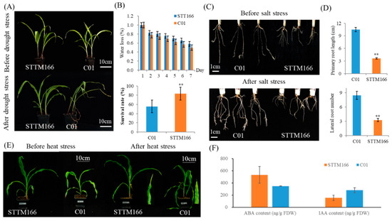 After seed germination, C01 and STTM166-M seeds were transferred into pots (10 cm × 10 cm) with 280 g soil. The plants were grown in plant chamber (RTQP-1000, TOP Instrument, Hangzhou, China) under 16 h of ~1200 µmol photons m−2 s−1 PPFD at 28 °C and 8 h of darkness at 25 °C, and ~70% relative humidity. The plants were well watered. To conduct drought and salt stress treated experiments, two-week-old pot-grown maize seedlings were subjected to water-limitation and NaCl solution (200 mM) treatments for three replicates [71,72]. In drought treatment, each replicate includes 12 seedlings of C01 and STTM166-M for 7 days water withholding. During the treating process, the water loss rate was measured for each day by weighting the plant pots. On the 8th day of water-limitation, the treated maize seedlings were re-watered, and the survival rate were recorded on the 8th day after re-watering. In salt treatment, each replicate includes 12 seedlings of C01 and STTM166, grown in 1/2 MS medium solution with 200 mM NaCl for 7 days. After salt stress, primary and lateral roots of C01 and STTM166 plants were counted. For heat stress treatment, three-week-old pot-grown maize seedlings of C01 and STTM166 were selected to grow in a plant incubator (RTQP-1000, TOP Instrument, Hangzhou, China) for 4 days, the growth condition was set as 16 h of ~1200 µmol photons m−2 s−1 PPFD at 38 °C and 8 h of darkness at 28 °C, ~70% relative humidity. These treated plants were well-watered without other stress.