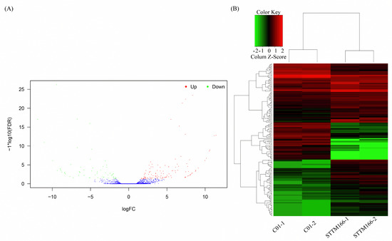 The differentially expressed genes (DEGs) between C01 and STTM166 plants. (A) Gene expression classification of DEGs. Red dots indicate up-regulated genes and green dots for down-regulated genes (Significant level: Padj <0.05, Log2FoldChange >1). (B) Heat map of the DEGs between C01 and STTM166 plants.