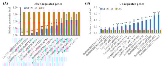 The expression analysis of DEGs between C01 and STTM166 by qRT-PCR. (A) The expression of down-regulated genes; (B) The expression of up-regulated genes. Actin was used as an internal control. * and ** represents that the corresponding gene expression levels of STTM166 plants are significantly different from the wild type p < 0.05 and p < 0.01, respectively. Bars show standard error of phenotypic values.
