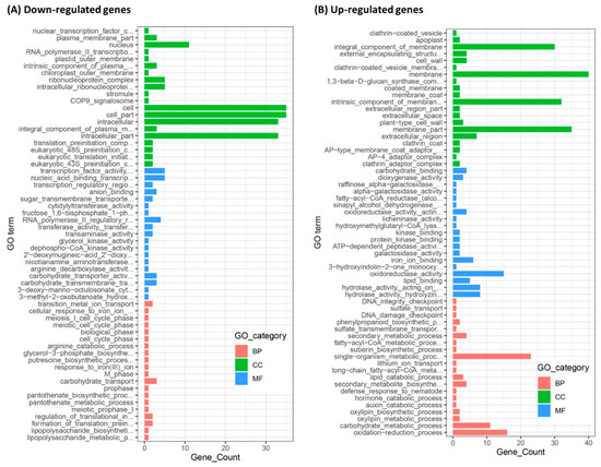 Gene ontology analysis of the screened DEGs between C01 and STTM166 plants. (A) Gene ontology analysis of the down-regulated genes; (B) Gene ontology analysis of the up-regulated genes. BP, biological process; CC, cell component; MF, molecular function.