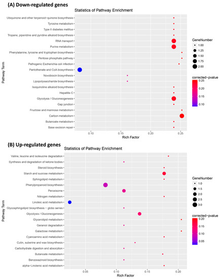 Kyoto encyclopedia of genes and genomes (KEGG) enrichment analysis of DEGs between STTM166 and C01. (A) The KEGG enrichment of the down-regulated genes; (B) The KEGG enrichment of the up-regulated genes.