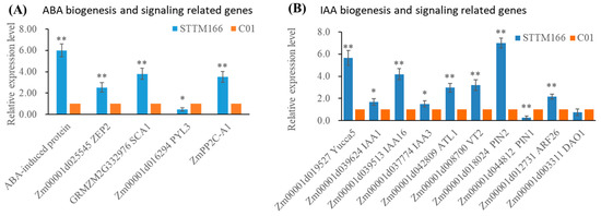 The expression levels of the key genes involved in ABA and IAA biogenesis and signaling pathways. (A) The expression of ABA biogenesis and signaling related genes; (B) The expression of IAA biogenesis and signaling related genes. Actin was used as an internal control. * and ** represents that the corresponding gene expression levels of STTM166 plants are significantly different from the wild type p < 0.05 and p < 0.01, respectively. Bars show standard error of phenotypic values.