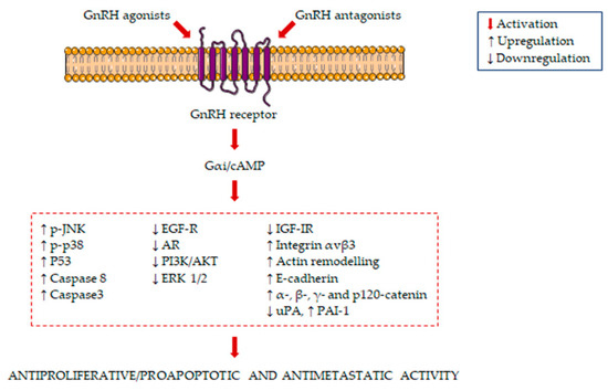 GnRH analog activities at the pituitary level (activation of the pituitary-gonadal axis) significantly differ from those at the cancer cell level (inhibition of cancer cell growth and metastatic behavior) suggesting that, according to the cell context, GnRH-R can be coupled to different G proteins and, therefore, to specific intracellular signaling pathways and molecular transducers [14,15,16,20,37,42,44,45,137,140,155,156].