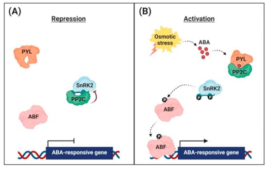 ABA regulates the PP2C concentration by inducing the expression of genes encoding transcriptional repressors or activators. These transcriptional regulators compete with the PP2C gene promoters, inducing chromatin remodeling and thus the switch from a repressive to an active state. In this manner, ABA simultaneously activates positive and negative regulatory systems affecting its own signaling pathway. The chromatin state acquired for osmotic stress tolerance can be memorized and transmitted to newly developed cells during vegetative growth [,] and even inherited by the next generation of plants; i.e., transgenerational epigenetic inheritance [,].