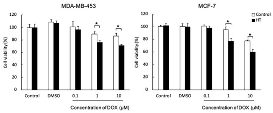 DOX was measured via a WST assay, which is a cell viability assay that uses the Cell Counting Kit-8. Figure 1 shows cell viability after combination treatment with HT and DOX. Cell viability of MDA-MB-453 and MCF-7 after combination treatment decreased significantly in 1 and 10 µM DOX-treated groups, compared with that in the non-HT group that had only DOX treatment. Furthermore, cell viability of both cell lines decreased dose-dependently of DOX. These results indicated that the combination treatment of HT and DOX showed an additive effect.