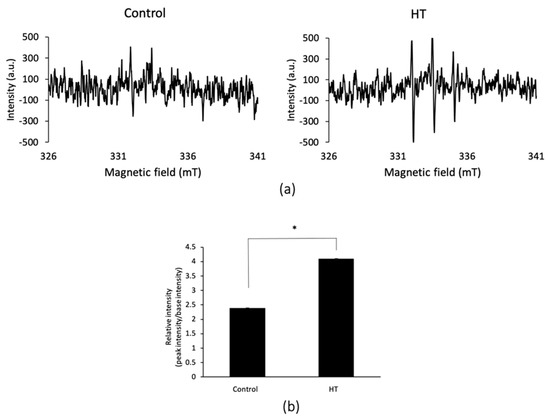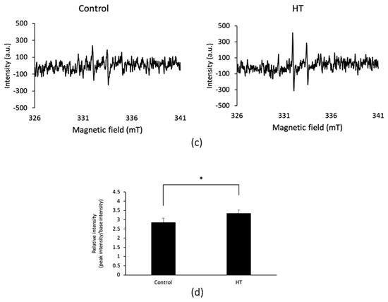 HT is known to increase intracellular ROS [14,15]. In the present study, the ratio of signal-to-noise peak intensities of ESR was also significantly increased by HT at 42 °C for 1 h, compared with those in the non-HT groups (Figure 2). Similarly, in experiments that use MitoSOXTM to detect mitROS, fluorescence intensities were significantly enhanced in the HT group (Figure 3). These results indicated that the ROS detected by ESR were of mitochondrial origin.