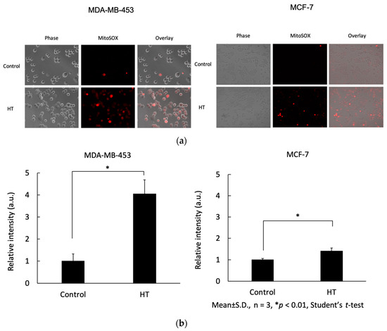 Mitochondrial ROS after HT or non-HT treatment in MCF-7 and MDA-MB-453 cells were measured using MitoSOXTM. (a) The fluorescence images were captured using an epifluorescence microscope. (b) The fluorescence intensities were analyzed using ImageJ Fiji. Statistical significance was tested via Student′s t-test. n = 3, error bar; S.D. * p < 0.01.
