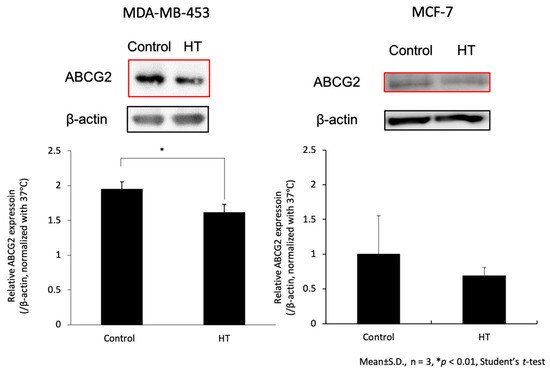 ABCG2 protein expression transitions after HT or non-HT treatment were analyzed using Western blotting. Statistical significance was tested via Student′s t-test. n = 3, error bar; S.D. * p < 0.01.