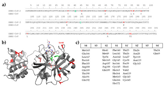 Comparison of SARS-CoV and SARS-CoV-2 3CL proteases. (a) Sequence alignment of the proteases is shown, only those residues are represented for SARS-CoV 3CLpro that are different as compared to SARS-CoV-2 3CLpro. Active site residues are green and underlined, residues that differ in the two proteases are red. (b) Schematic structure of SARS-CoV-2 3CLpro based on its X-ray crystal structure (6LU7.pdb). Catalytic residues (His41 and Cys145) are highlighted by green color, the residues that are different in SARS-CoV and SARS-CoV-2 3CL proteases are shown by red. Ser46 residue is also highlighted. Inhibitor bound to the active site is also shown by sticks. (c) Compositions of substrate binding subsites are shown based on literature data [11,12,13,16], subsite nomenclature is shown according to Schechter and Berger [15].