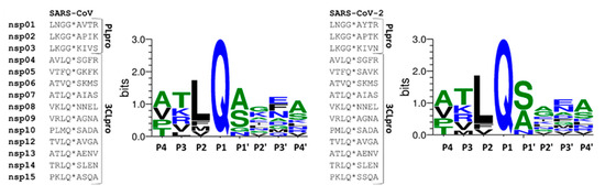 Comparison of SARS-CoV and SARS-CoV-2 cleavage site sequences. Sequences are shown for PLpro and 3CLpro based on literature data [15,16]. Cleavage positions are shown by asterisks, the sequences enclosed by the lines were used to prepare sequence logos. P4-P4’ substrate residues are numbered according to the nomenclature of Schechter and Berger [15].