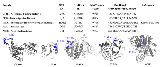 The sets of experimentally determined cleavage sites—e.g., obtained from in vitro proteomic analysis [21]—are expected to aid the improvement of prediction algorithms’ reliability, while our results also represented some limitations of the applied in silico methods and highlighted the necessity of structural analysis and determination of cleavage site accessibilities, otherwise, candidate targets can be identified only with lower accuracy.
