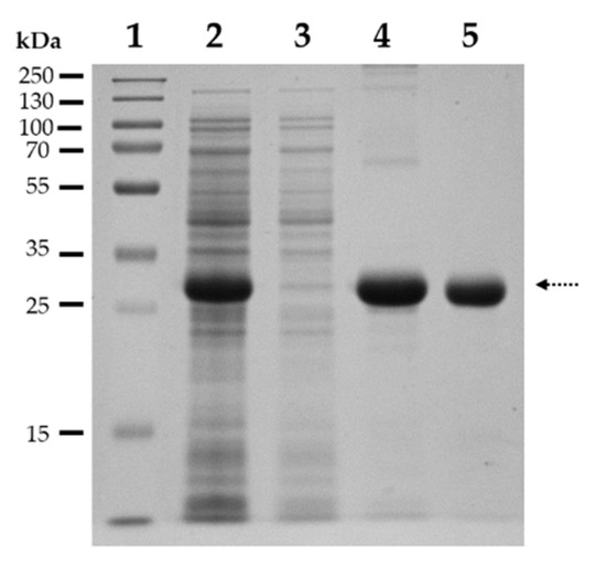 Purification of SARS-CoV-2 3CLpro. Figure shows a Coomassie-stained gel image, after SDS-PAGE analysis of samples: (1) Molecular weight standard; (2) Soluble lysate; (3) Ni-NTA affinity chromatography, flowthrough; (4) Ni-NTA affinity chromatography, eluate fraction of His6-SARS-CoV-2 3CLpro; (5) ion-exchange affinity chromatography, eluate of untagged SARS-CoV-2 3CLpro. Dotted arrow shows SARS-CoV-2 3CLpro, which has a slightly lower molecular weight than the His6-tagged enzyme.