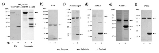 Cleavage of recombinant proteins by SARS-CoV-2 3CLpro. After cleavage reactions by SARS-CoV-2 PR, reaction mixtures were analyzed by SDS-PAGE. Uncleaved proteins and SARS-CoV-2 PR are shown by continuous and dashed lines, respectively, while asterisks indicate cleavage products. (a) Cleavage of His6-MBP-TSAVLQ*SGFRKM-mEYFP. After in-gel renaturation, the full-length substrate and SGFRKM-mEYFP cleavage product were visualized UV illumination, and the gel was stained with Coomassie dye, as well. (b) Cleavage reaction of recombinant BSA. (c) Cleavage reaction of recombinant plasminogen. (d) Cleavage of reaction recombinant IRAK1. (e) Cleavage reaction of recombinant PTK6. (f) Cleavage reaction of recombinant CTBP1. Gel images are representatives of ≥2 parallel experiments.