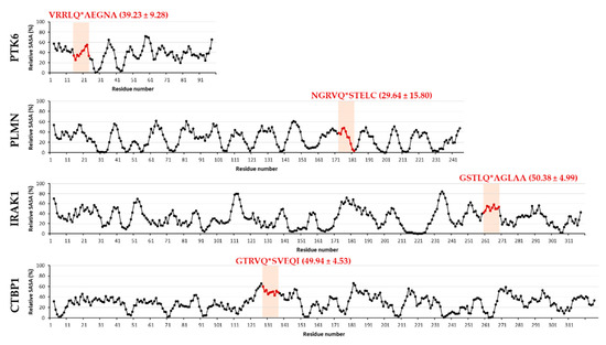 Analysis of surface-accessible surface areas. Relative surface-accessible surface area (SASA) values (%) determined for all atoms in PTK6, PLMN, IRAK1, and CTBP1, and were averaged for every position in a 5-residue window. Values for P5–P5’ residues are highlighted by red, the average-of-average and SD values calculated for P5–P5’ sites are shown in brackets. Residue numbering starts in each case from the first residue of the protein in the coordinate file.