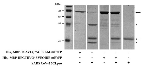 Cleavage of recombinant fusion protein substrates by SARS-CoV-2 3CLpro. His6-MBP-mEYFP substrates containing TSAVLQ*SGFRKM (SARS-CoV-2 nsp4) or REGTRVQ*SVEQIRE (CTBP1) cleavage site sequences were digested with SARS CoV-2 3CLpro. After SDS-PAGE, the gel was stained with Coomassie dye. Uncleaved proteins and SARS-CoV-2 PR are shown by continuous and dashed lines, respectively, while asterisks indicate cleavage products. Gel images are representatives of ≥ 2 parallel experiments.