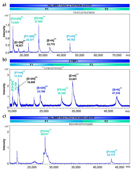 The reaction mixtures were analyzed by matrix-assisted laser desorption/ionization time-of-flight mass spectrometry (MALDI-TOF MS) and the molecular weights of cleavage fragments were determined for the identification of cleavage positions. As was expected, the recombinant His6-MBP-mEYFP substrate representing the nsp4 cleavage site sequence of the polyprotein (TSAVLQ*SGFRKM) was cleaved within the incorporated sequence at the desired position (Figure 9a). After the cleavage of recombinant CTBP1 protein, the analysis of cleavage fragments implied that the full-length protein is cleaved at the predicted site (153GTRVQ*SVEQI162) (Figure 9b), and the recombinant His6-MBP-mEYFP substrate containing the same cleavage site was also cleaved at the same predicted position (Figure 9c). These results proved that the fluorescent substrates are suitable for fluorimetric assay.