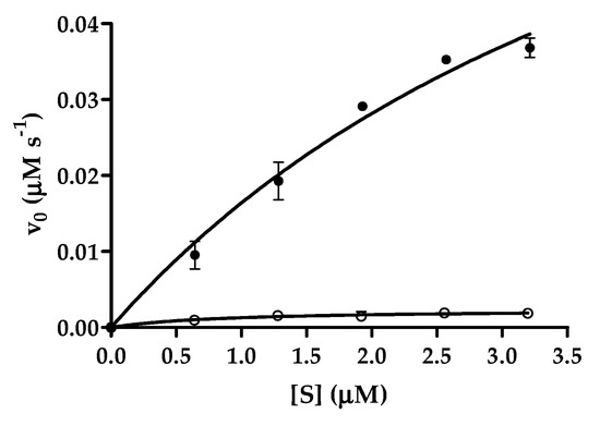 Kinetic analysis of SARS-CoV-2 3CLpro using recombinant fusion protein substrates. Data obtained for His6-MBP-TSAVLQ*SGFRKM-mEYFP and His6-MBP-REGTRVQ*SVEQIRE-mEYFP substrates are shown by full circles and squares, respectively. Averages of values obtained from two parallel experiments are plotted, error bars represent SD. Kinetic parameters are shown in Table 2.
