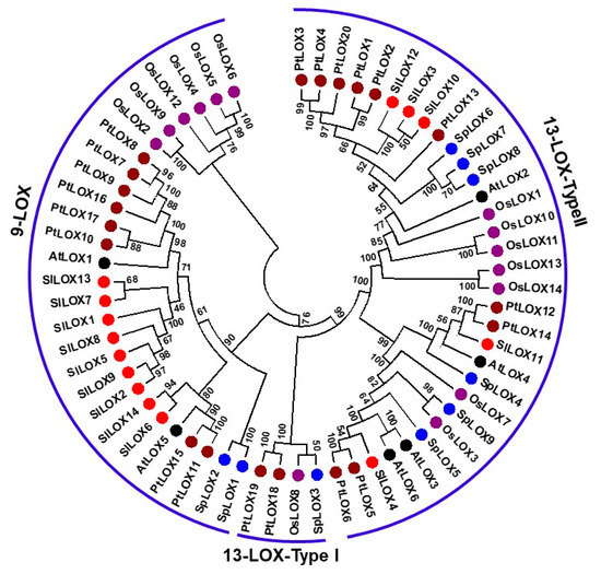 To establish an evolutionary relatedness of the Spirodela LOX gene family to other known LOX gene families, we utilized sixty-three protein sequences belonging to duckweed (9), tomato (14), Arabidopsis (6), rice (14), and poplar (20) LOX genes. Only previously characterized complete LOX gene families were considered for the phylogenetic relationship. A maximum likelihood method based on the JTT matrix-based model divided the nine Spirodela LOX proteins into two distinct subfamilies: 9-LOX and 13-LOX, based on their substrate preferences.