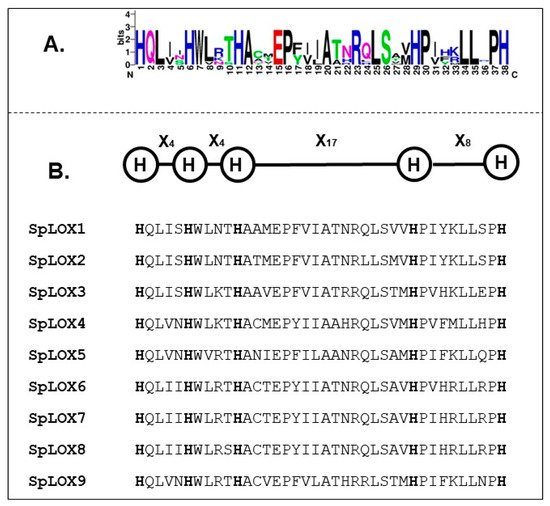 The lipoxygenases contain six histidine residues, five of which exhibit a conserved pattern in most known lipoxygenase proteins [35]. The positions of the histidine residues in the 38 amino-acid-residue stretch making up the 5-Histidine signature domain are highly conserved in all nine Spirodela LOXs (Figure 2A). This same arrangement, His-(X)4-His-(X)4-His-(X)17-His-(X)8-His, was previously found in other plant LOX protein sequences; for example, in poplar [44], tomato [35], and radish [49] (Figure 2B). The conserved histidine motif has been suggested to play an important role in lipoxygenase enzyme stability and activity [35].