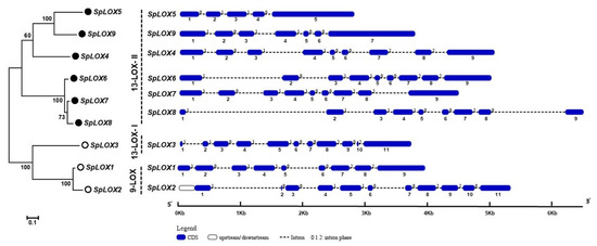 A separate phylogenetic tree was constructed using the nine duckweed LOX coding sequences to compare the exon/intron organization (Figure 3). The intron distribution pattern along with the phase distribution was detected by aligning the Spirodela genomic and coding sequences. Similar exon arrangements have been suggested to indicate a high duplication rates within the LOX family [44]. The Spirodela LOX family has asymmetrical exon positioning and different phases of intron distribution, which suggests that all SpLOX proteins have gone through protein evolution as part of organismal complexity (Figure 3).