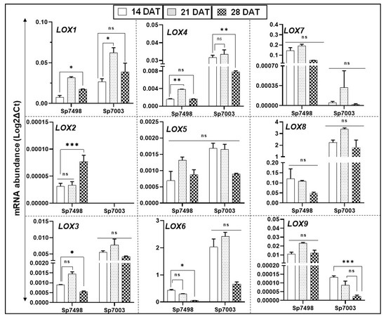 qRT-PCR analysis of LOX genes in two clones of Spirodela polyrhiza, Sp7498and Sp7003. Cultures were grown for 28 days in nutrient solution and samples collected at 14, 21, and 28 days of growth. Confluence of plants in the culture flasks was reached after 21 days of growth. mRNA expression profiles of whole plants from the two clones were analyzed. SpACT and Sp18SrRNA housekeeping genes were used to normalize the expression of LOX genes, as described in Materials and Methods. Analysis of variance (ANOVA) with Dunnett’s multiple comparisons test was performed for significant differences in LOX gene expression in the aging plants. Statistical significance between expression data points was assessed against the 14-day expression profiles and categorized as * p < 0.05, ** p < 0.01, and *** p < 0.001 using Graph Pad (version 8.0); ns: not significant.