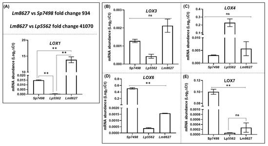Comparative qRT-PCR analysis of LOX genes in Spirodela polyrhiza 7498, Lemna minor 8627, and Landoltia punctata 5562. Plants were taken for expression analysis at different ages of culture. All cultures were grown for 28 days in nutrient solution and samples were collected at 14, 21, and 28 days of growth. The SpACT and Sp18SrRNA housekeeping genes were used to normalize the expression of LOX genes, as described in Materials and Methods. (A) LOX1, (B) LOX3, (C) LOX4, (D) LOX6, and (E) LOX7 expression comparison was made among the three strains. ANOVA with Dunnett’s multiple comparisons test was performed for significant differences in LOX gene expression in the aging tissues among the duckweed species. Statistical significance between aging expression data points was assessed against the 14-day expression profiles and categorized as ** p < 0.01, using Graph Pad (version 8.0); ns: not significant.