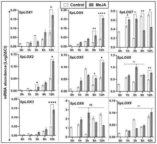 The GraphPad (version8.0) suite was used for statistical analysis. ANOVA was performed for significant differences in LOX gene expression. For the MeJA experiment and salt treatment, significant differences were calculated against non-treated control samples at each time point, and categorized at * p < 0.05, ** p < 0.01, and **** p < 0.0001 for each analysis as before [36].