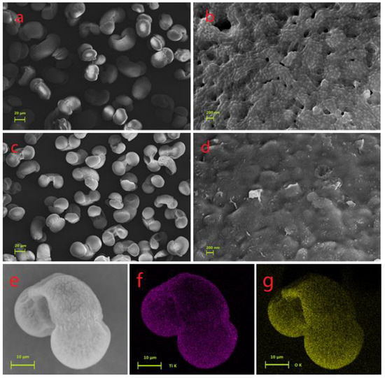SEM photographs of the pollen grains before (a,b) and after (c–e) being modified with boric acid-functionalized titania, and the energy dispersive X-ray mapping images of the modified pollen grain for the identification of titanium (f) and oxygen (g). (a,c) 200×; (b,d) 20000×; (e–g) 1700×.