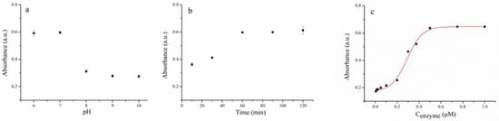 Effects of (a) loading pH, (b) loading time, and (c) initial concentration of enzymes during immobilization. Data were obtained from the average values of three replicated measurements.