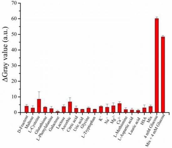 Owing to the complexities of the body fluid samples, the proposed analytical methods should be with high selectivity in practical applications. To investigate the selectivity of this pollen grains-based method, the control solutions containing different substances which were the main potential interferences with competitive effects to glucose in blood or urine were tested [37]. All the substances were prepared at 10-fold concentrations of their normal levels in human body fluids (listed in Supplementary Table S4). As shown in Figure 4, the ΔGray values obtained with glucose were much higher than the controls and remained greater than 80% with the mixture of all agents. The results demonstrated that these substances had little impact on the enzyme-immobilized pollen grains, and the established method had potential for the determination of glucose in body fluids.