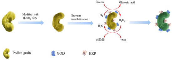 Proposed mechanism of the enzyme immobilization onto the pollen grain and the visual determination of glucose.