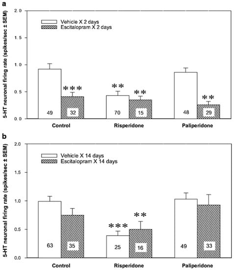 Serotonergic augmentation of the selective serotonin reuptake inhibitors (SSRI) escitalopram response by the atypical antipsychotic drug paliperidone. Effect of the subchronic (a) and chronic (b) risperidone or paliperidone, alone or in combination with escitalopram, on the excitability of 5-HT neurons of the dorsal raphe nucleus (DRN). The animals were implanted with minipumps containing the vehicle or escitalopram (10 mg/kg/day) for two or fourteen days and received the subcutaneous vehicle, risperidone or paliperidone injections (1 mg/kg each). After two days, there was a significant effect of escitalopram (Fdf1243 = 26.16, p < 0.001), risperidone and paliperidone (Fdf2243 = 3.99, p < 0.05), and escitalopram × risperidone/paliperidone interaction (Fdf2243 = 3.93, p < 0.05). After fourteen days, there was a significant effect of risperidone and paliperidone (Fdf2221 = 6.61, p < 0.01). The number of neurons recorded in each group is provided within the histograms. ** p < 0.01 and *** p < 0.001 in comparison with control animals. From Dremencov et al. 2007 [38]. Reused by permission of Springer Nature.