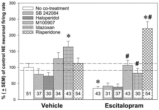 Noradrenergic augmentation of the SSRI escitalopram response by the atypical antipsychotic drug risperidone. The animals were implanted with minipumps containing vehicle or escitalopram (10 mg/kg/day; the main treatment) for two days and were subcutaneously (s.c.) co-treated with vehicle, risperidone (1 mg/kg/day), SB 242084 (0.5 mg/kg/day), haloperidol (0.1 mg/kg/day), M100907 (0.5 mg/kg/day), or idazoxan (1 mg/kg/day; co-treatments) for two days. Two-way ANOVA showed a significant effect of the main treatment (Fdf1486 = 5.41, p < 0.05), of the co-treatment (Fdf5486 = 17.18, p < 0.001), and treatment × co-treatment interaction (Fdf5486 = 11.07, p < 0.001). * p < 0.01, in comparison with control animals and # p < 0.05, in comparison with animals administered escitalopram alone, Bonferroni post hoc test. The number of neurons recorded in each group is provided within the histograms. From Dremencov et al. 2007 [61]. Reused by permission of Elsevier.