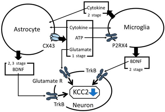 Several purinergic receptors are expressed in the microglia. CX43 hemichannel-mediated ATP releases also serve as mediators of intercellular astrocyte–microglia cell interactions. These receptors, including P2X purinoreceptor 4 (P2RX4), P2RX7, and P2Y purinoreceptor 12, are upregulated in the spinal microglia and play a key role in the development of neuropathic pain (see, for review, []). The stimulation of P2RX4 upregulates BDNF synthesis and release in the microglia [,]. The enhancement of BDNF expression decreases KCC2 expression in neurons via the BDNF–TrkB–KCC2 cascade reaction. Therefore, the CX43-mediated ATP release induces BDNF secretion from the microglia by stimulating P2RX4, which, in turn, activates the TrkB receptor in neurons and suppresses KCC2 expression.