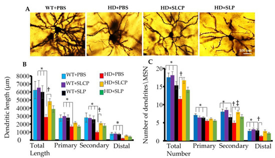 Morphology of medium spiny neurons (MSNs). (A) Golgi-cox staining of MSNs from all groups showed differences in the number and length of dendrites between different groups. Images in this figure were taken using a light microscope at 40× objective. (B) Total dendritic length, primary, secondary, and distal dendrite lengths. (C) Total number of dendrites, primary, secondary, and distal dendrites for every MSN from all groups. (B,C) There was a significant difference in the total length of dendrites between WT and HD vehicles (p = 0.001). However, HD mice treated with SLCPs were not significantly different compared to WT controls (p = 0.153). Additionally, HD mice treated with SLCPs were marginally significant different from HD controls (p = 0.05). For the total number of dendrites, there was a significant difference between WT- and HD-vehicle groups (p < 0.05), but no significant differences between WT and HD mice treated with SLCPs. * p < 0.05, HD+PBS compared to WT+PBS. † p < 0.05, HD+SLCPs compared to HD+PBS. ‡ p < 0.05, HD+SLP compared to HD+PBS.