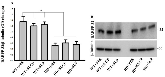 Western blots of DARPP-32. (A,B) There was a significant elevation in DARPP-32 levels in WT groups compared to HD groups, but there were no significant differences between HD+PBS, HD+SLCPs, and HD+SLPs groups. * p < 0.05 between all HD groups compared to all WT groups.