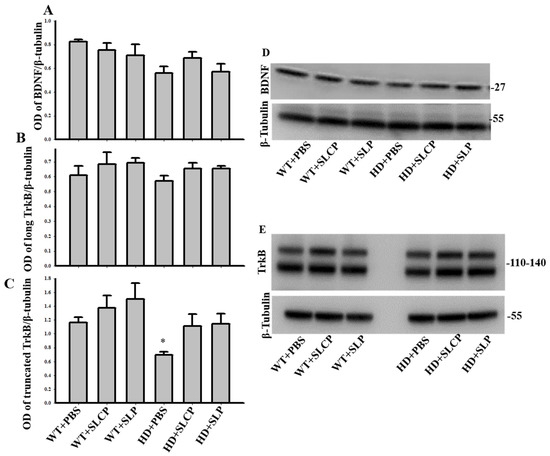 Western blots of brain-derived neurotrophic factor (BDNF) and TrkB. (A,D) A one-way ANOVA of BDNF data revealed no overall between-group difference (p = 0.069). (B,C,E) There was no overall between-group difference in long TrkB (p = 0.503), but treatments of either SLCPs or SLPs prevented significant declines in levels of truncated TrkB in HD mice. * p < 0.05, HD+PBS compared to WT+SLCP and WT+SLP.