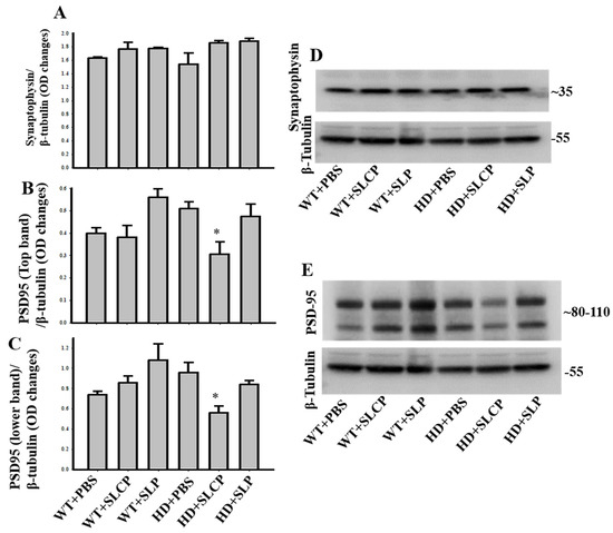 Western blots of synaptophysin and PSD-95. (A,D) A one-way ANOVA of synaptophysin levels showed no overall significant difference between groups (p = 0.089). (B,C,E) Upper and lower bands of PSD-95 revealed no significant differences between WT- and HD-vehicle groups (p > 0.05). However, HD+SLCPs mice had significant decreases in PSD-95 levels compared to HD+PBS and HD+SLP (p < 0.05), but were not different compared to WT+PBS. * p < 0.05, HD+SLCP compared to HD+PBS.