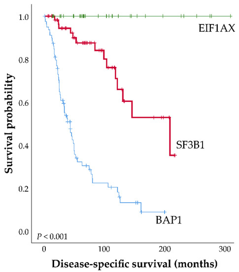Disease-specific survival plot of Uveal melanoma (UM) patients, defined as the first date of treatment until the date of metastasis or until last follow-up. Patients were censored when they were lost to follow-up or when death from a cause other than UM occurred. Updated Kaplan-Meier curve of SF3B1-mutated UM adapted and updated from Yavuzyigitoglu et al. [21]. Three groups of patients with secondary driver gene mutations: n = 185; EIF1AX, n = 33; SF3B1, n = 63; BAP1, n = 89).