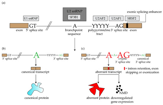 Mature mRNA is produced by removing the noncoding intronic sequences and ligating the coding sequences of pre-mRNA. This process—splicing—is regulated by the spliceosome. There are two types of this RNA/protein structure: the major spliceosome complex—involved in “general” or canonical splicing—and the minor spliceosome complex involved in non-canonical splicing (often resulting in tissue specific transcripts) [28,29]. Each of these spliceosome complexes include five crucial small nuclear ribonucleoprotein particles (snRNP): U1, U2, U4, U5 and U6 in the major spliceosome and U11, U12, U4atac, U5 and U6atac in the minor spliceosome. These particles recognize specific intronic consensus sequences: U2-type introns are recognized by the major spliceosome complex and U12 type sequences by the minor spliceosome. Canonical splicing occurs when consensus sequences in the intron: the 5′ donor splice site (5′ss), the 3′ acceptor splice site (3′ss), and the branchpoint sequence (BPS), are recognized by U1 snRNP, U2AF (U2 small nuclear RNA auxiliary factor) and U2 snRNP protein, respectively. U2AF is a heterodimer and together with the U2AF2 (U2 small nuclear RNA auciliary factor 2), it recognizes the AG dinucleotide sequence and the polypyrimidine (Py) tract of the 3′ss and coordinates the binding of the U2 snRNP at the BPS. Interaction of U1 and U2 snRNP generates junction of the 5′ end of the intron to the BPS (Figure 2). The 5′ss and 3′ss ligate together, which results in a mature mRNA product [30]. The U2 snRNP includes the SF3b1 subunit encoded by the SF3B1 gene.