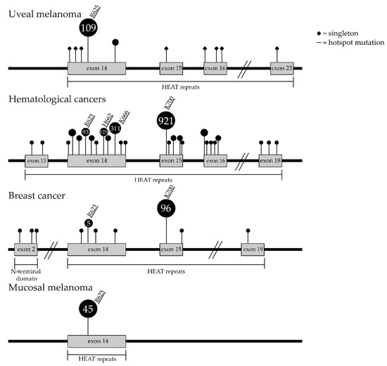 Mutations in SF3B1 are almost exclusively clustered in a specific repeat sequence motif: the 22 non-identical HEAT (Huntington, Elongation factor 3, protein phosphatase 2A, Targets of rapamycin 1) repeats domain region. Mutations in this motif have been shown to affect the interaction with the DDX46 (DEAD-Box Helicase 46) protein (prp5 in yeast) necessary for stable association of U2 snRNP to the pre-mRNA [41]. In UM, hotspot mutations are mostly in the fifth HEAT repeat at codon position arginine (R) 625, although occasionally other mutations have also been reported (Table 1). In contrast, hotspot mutations in the sixth and seventh HEAT repeat codon position lysine (K) 666 and K700, respectively, are seen in the other cancers such as hematologic cancer and breast cancer (Figure 3) [31,33,42]. The few mutations outside the HEAT repeat domains do not display aberrant splicing, suggesting they have different effects on cancer cells or have no effect and are simply passenger mutations [39]. The outcome of a large study of 533 patients with MDS indicated that patients with SF3B1 mutations were associated with a better overall survival and a lower risk of progression to acute myeloid leukemia compared to patients without SF3B1 mutations [43]. Moreover, SF3B1 mutations in MDS is an independent predictor of favorable outcome, although other studies indicated no significant effect on overall survival and were associated with shorter leukemia-free survival [44]. In breast cancer, SF3B1 mutations are associated with poor prognosis in PR-negative and luminal B subgroups [45].