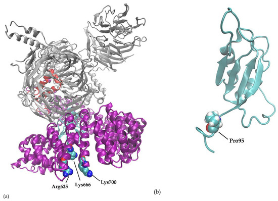 Three-dimensional view of the proteins. (a) SF3B1 protein with hotspot residue R625, K666 and K700. (b) SRSF2 protein with hotspot P95.
