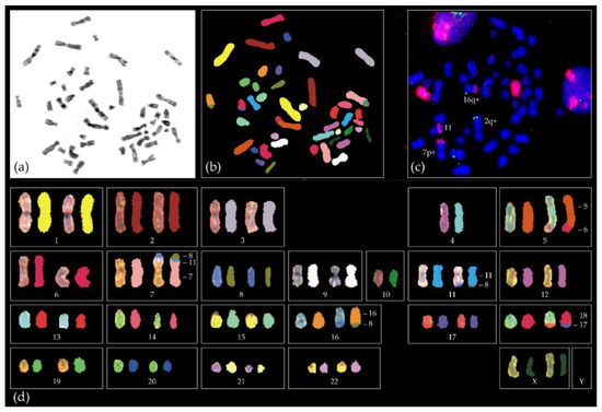 Example of the complex chromosome aberrations of a SF3B1-mutated tumour of a 38 year old female. Shown is (a) metaphase spread with DAPI staining, (b) spectral karyotyping in which each chromosome has a specific color, (c) red chromosome 8 paint and green telomeric 6q probe and (d) spectral karyotype showing exchanges between different chromosomes. For instance, part of chr6 (red) is attached to the bottom part (q-arm) of chromosome 5 (orange). The upper arm (p-arm) of chromosome 7 has material of chromosome 11 (blue) and 8 (green). Full karyotype in Naus et al. [53].